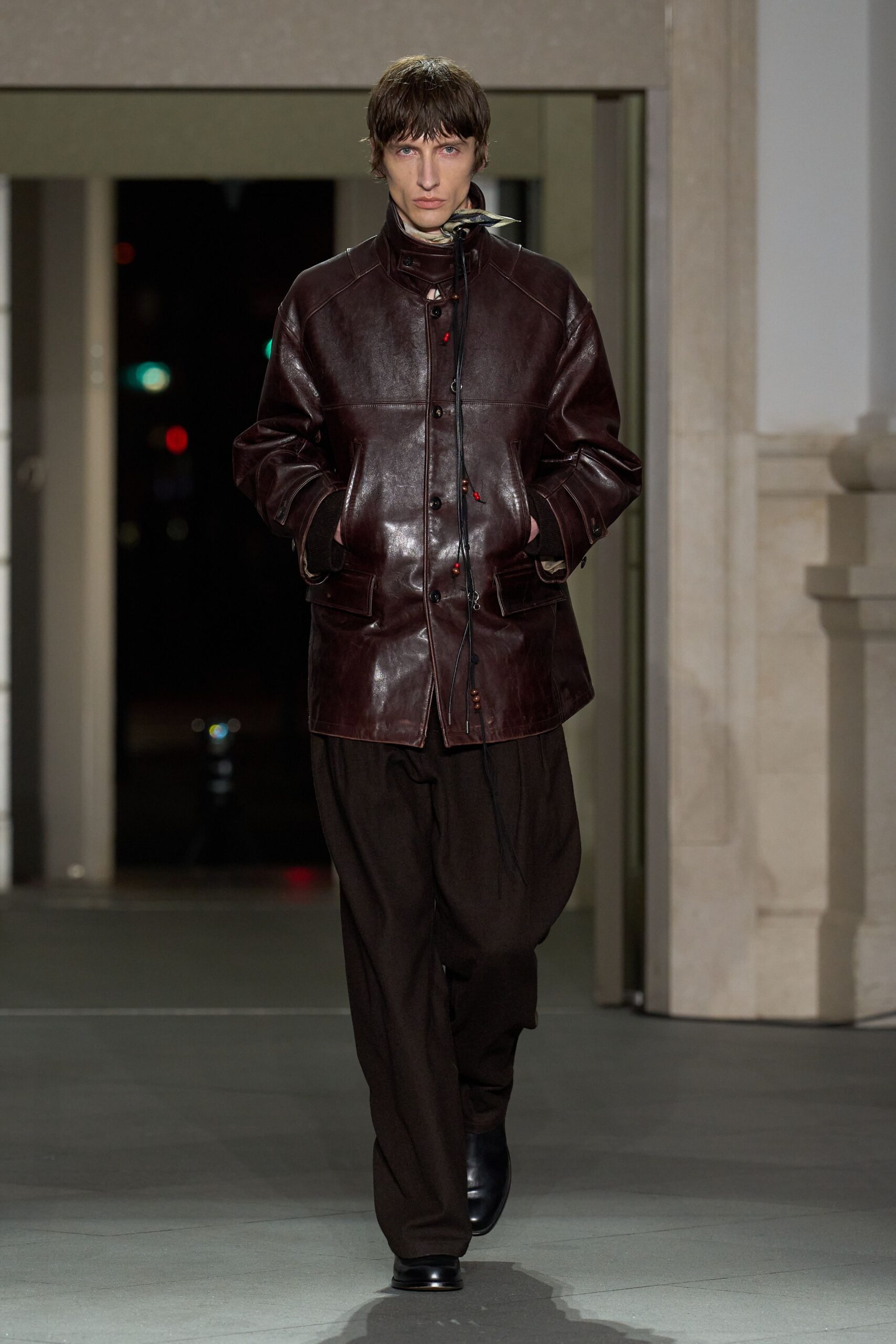 Yamachika conducts hundreds of mad experiments with fabrics each season—shrinking, washing, dyeing—and doing things that “you’re not really supposed to do,” like washing leather jackets. “I fail a lot,” he said. Still, when he succeeds—eureka! This season those moments were plentiful on the runway, from fuzzy wool cardigans to artfully dirtied denims, wide-wale corduroy, and rumpled leathers in a spectrum that spanned soft pink to apple green via a wash of earthy browns and chalky white. The distressed element—apparent in the rough-hemmed tailoring, faded work jackets, and chewed up sweater hems—was especially interesting, and helps Ancellm stand out from the many product-focused menswear brands saturating the market at the moment. All in all, a buyer-friendly collection, and worth the journey.