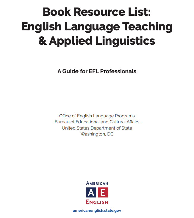 The book resource list that follows was originally developed to support English Language Fellows, English Language Specialists, and Regional English Language Officers in identifying resources that will aid them in completing projects sponsored by the Office of English Language Programs, Bureau of Educational and Cultural Affairs, U.S. Department of State. However, this resource may be of interest to any English language teaching professional working in an English as a foreign language (EFL) context.
