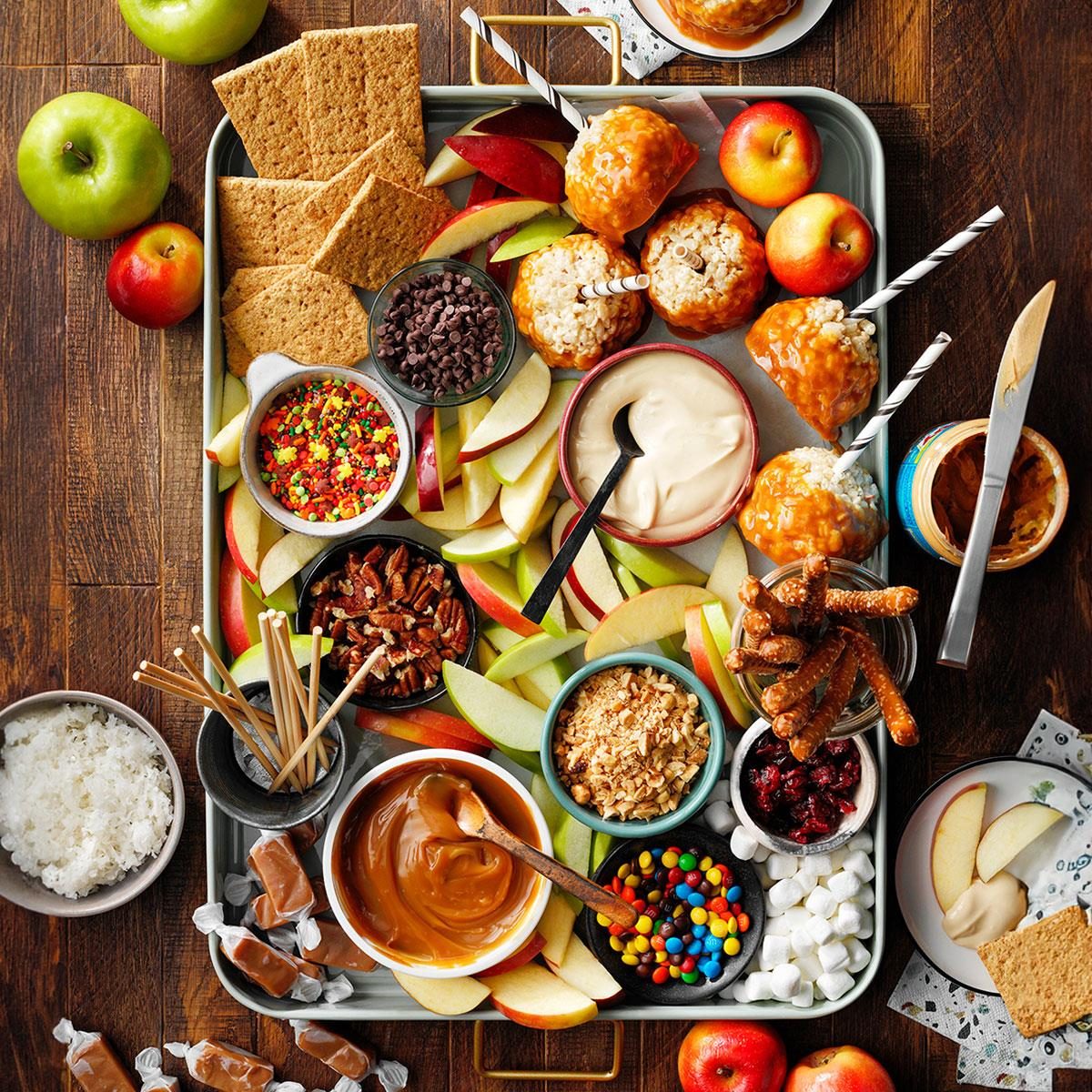 - Dippers: Add pretzel rods, popcorn balls and graham cracker squares as dippers so you and your guests don’t get apple-d out.