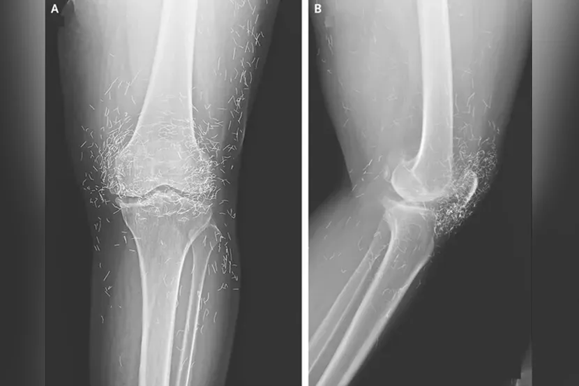 An X-ray exam revealed a thickening and hardening of the inner part of the tibia, bony growths in the knee, all common symptoms of osteoarthritis – but also hundreds of tiny gold threads embedded in the tissue around the knee. Doctors warn that gold thread acupuncture has no scientifically-proven benefit for the patient, but comes with many known risks. The tiny threads can cause cysts, migrate into the body, and damage surrounding tissue, but they can also make potentially life-saving MRI scans impossible because of the risk of metal displacement and blood vessel damage.