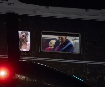 President Donald Trump looks out the window with Eric Trump, executive vice president of Trump Organization Inc., left, and Natalie Harp, executive assistant to President Donald Trump, center, aboard Marine One on the South Lawn of the White House Friday. Trump’s $10 billion suit against the Wall Street Journal was tossed by a judge Monday. Photo by Al Drago/UPI | License Photo