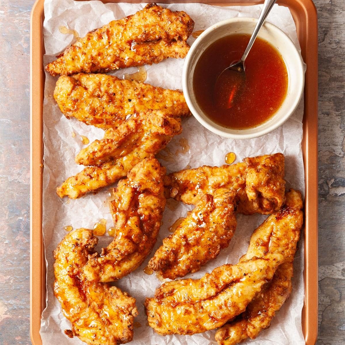 A sweet and spicy hot honey sauce makes these family-favorite chicken tenders truly irresistible. —Susan Bronson, Rhinelander, Wisconsin