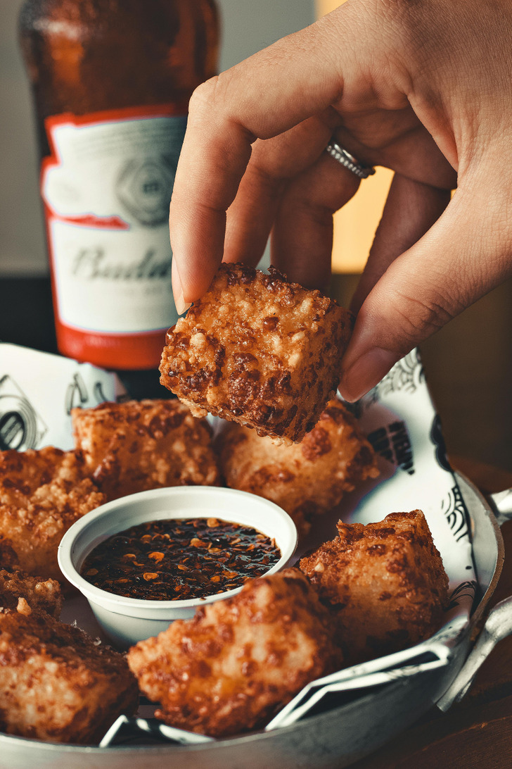- Heat the oil in a pan over medium-high — it should shimmer before the tofu goes in. Add tofu in a single layer and don’t touch it for four minutes. Flip. Another three minutes. The edges should be genuinely golden and a little fierce-looking. Set aside.