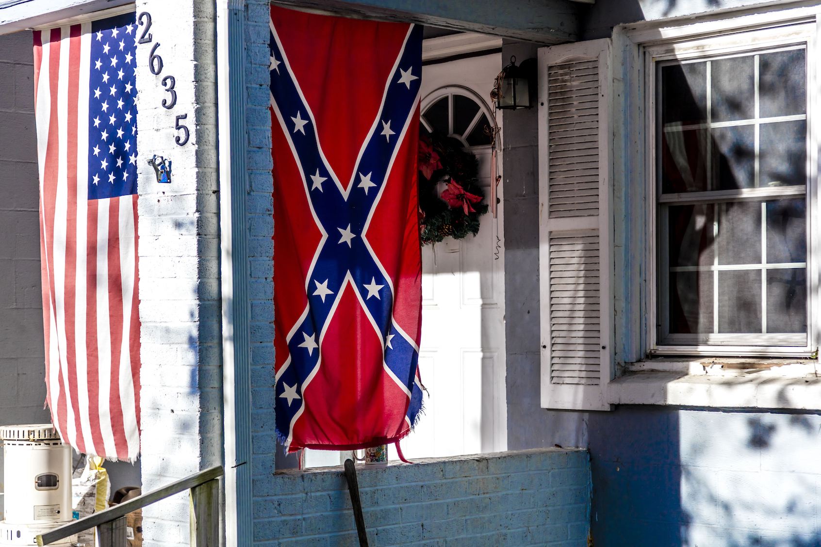 Confederate Flag Displayed With Us Flag On Front Porch Near Window, Backroads Of Virginia, October 26, 2016. (Photo by Joe Sohm/Getty Images)