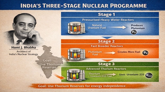 The Fuel Challenge and Thorium Opportunity: India has limited uranium but large thorium reserves. This shaped the three-stage nuclear plan proposed by Homi J Bhabha. Thorium cannot directly fuel reactors, but it can be converted into uranium-233 inside a reactor. If this becomes commercially viable, it could provide a long-term domestic energy source for India. The Kalpakkam reactor marks India’s move into Stage 2. (Image: AI Generated Infographic)