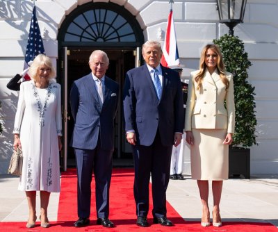 Britain’s King Charles III (2nd L) and Queen Camilla (L) are greeted by President Donald Trump (2nd R) and First Lady Melania Trump at the White House in Washington D.C., on Monday at the start of a four day state visit. Photo by Allison Robbert/UPI | License Photo
