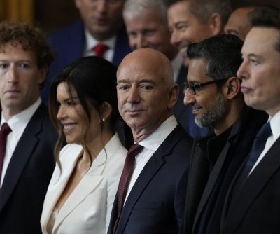 Mark Zuckerberg, Lauren Sanchez, Jeff Bezos, Sundar Pichai and Elon Musk, attend the presidential inauguration of President Donald Trump on Monday, January 20, 2025. File Pool Photo by Julia Demaree Nikhinson/UPI | License Photo