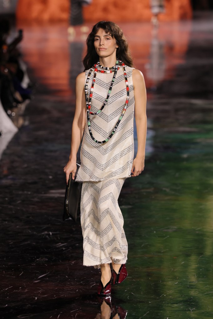 Lux was the epitome of Parisian chic, styled in a sleeveless chevron-print tunic and a matching midi skirt, accessorizing with large colorful necklaces, burgundy heels and a black clutch.