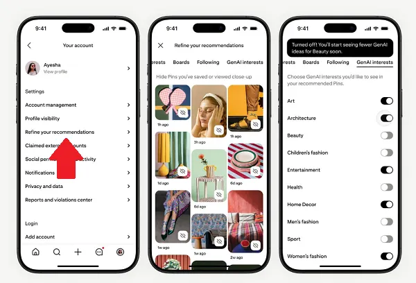 As you can see in these example screens, Pinterest is adding a new “GenAI interests” element to its recommendation settings, which will enable users to indicate that they don’t want to see generative AI pins in specific categories.
