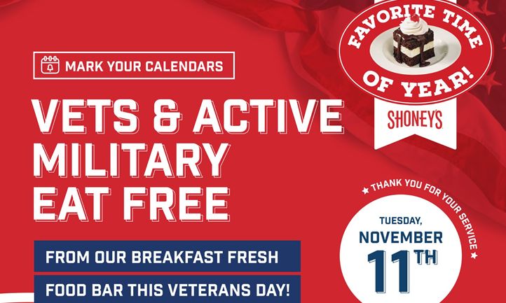 America (RestaurantNews.com) Shoney’s, a true pioneer and a decorated darling in the restaurant industry, will continue its commitment to America’s heroes past and present this Veterans Day, Tuesday, November 11, 2025. All veterans, including active-duty military, are cordially invited to enjoy The Best Breakfast in Town® via its freshly prepared Legendary Breakfast Bar® for FREE at participating restaurants.
