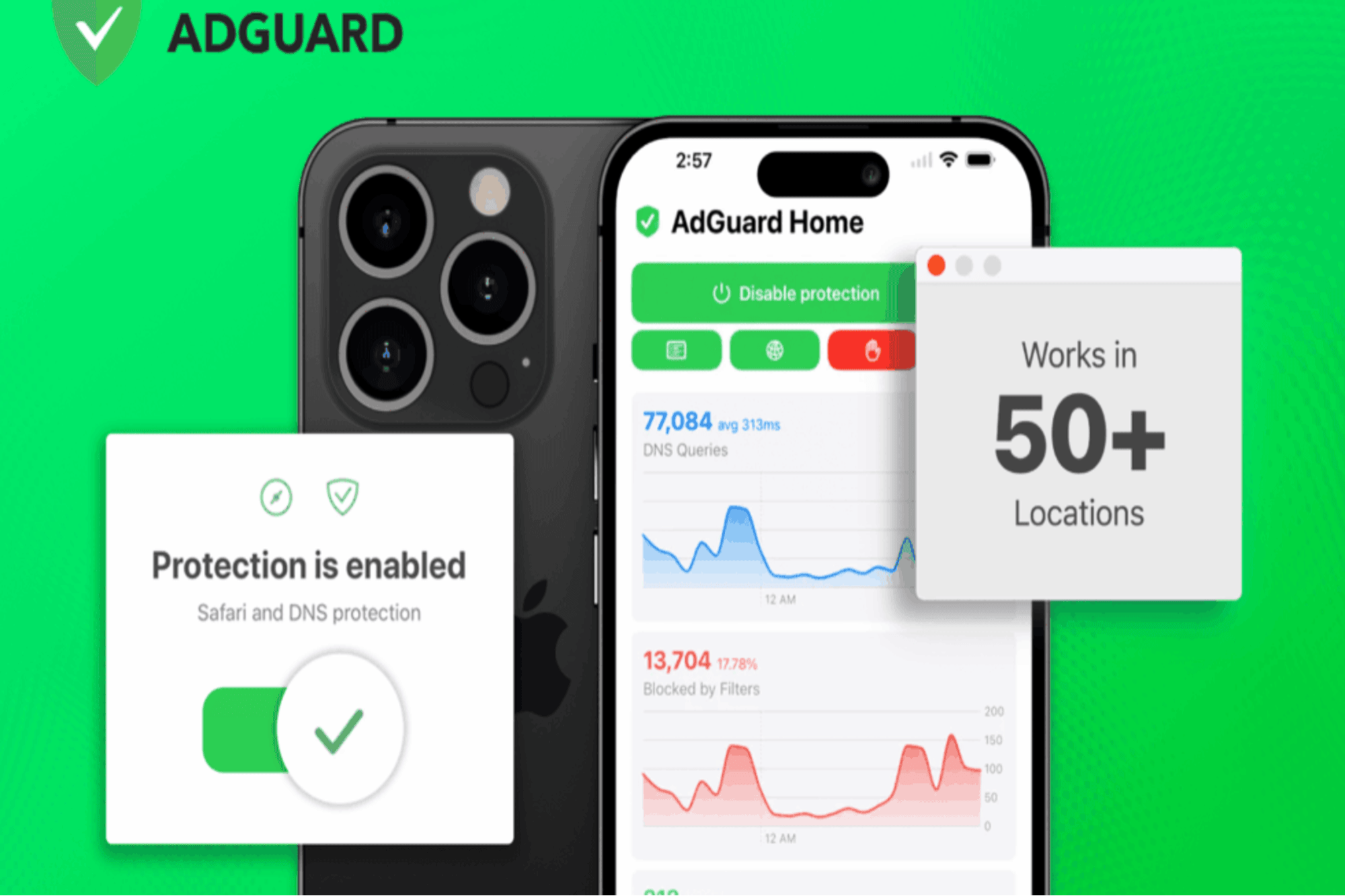 With a strict zero-logging policy, AdGuard VPN ensures that your browsing history and activity stay private — even from them. And because your subscription supports up to 10 devices simultaneously, you can cover your laptop, phone, tablet, and workstations in one go. Or you can cover 10 of your staff’s devices.