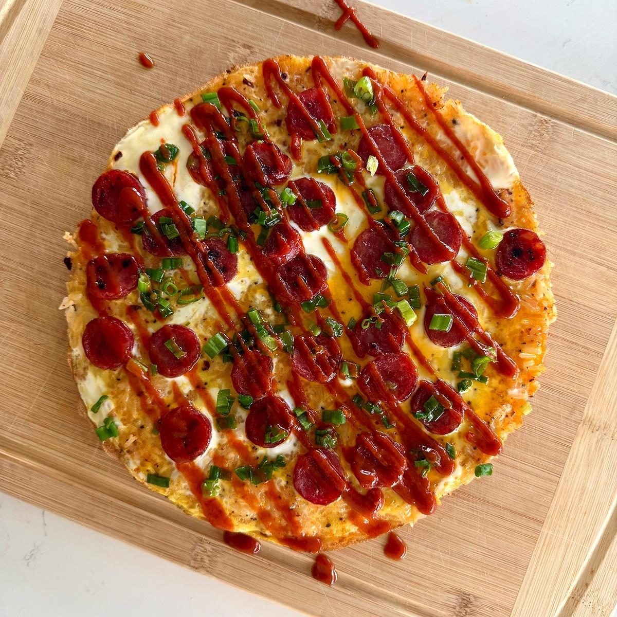 - Remove from pan to a cutting board. Garnish with Sriracha and scallion oil, then cut into slices to serve.