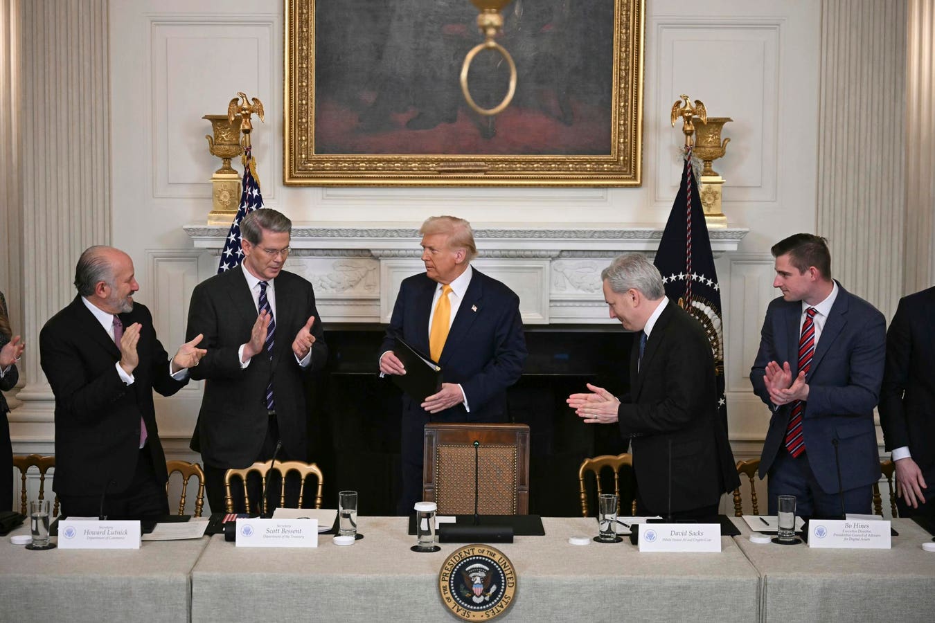 Bo Hines (far right), the former executive director of the presidential council of advisers for digital assets, pictured attending the White House Crypto Summit in Washington in his former role, next to from right to left David Sacks, White House Crypto and AI Czar, President Trump, Secretary of Treasury Scott Bessent, and Secretary of Commerce Howard Lutnick.