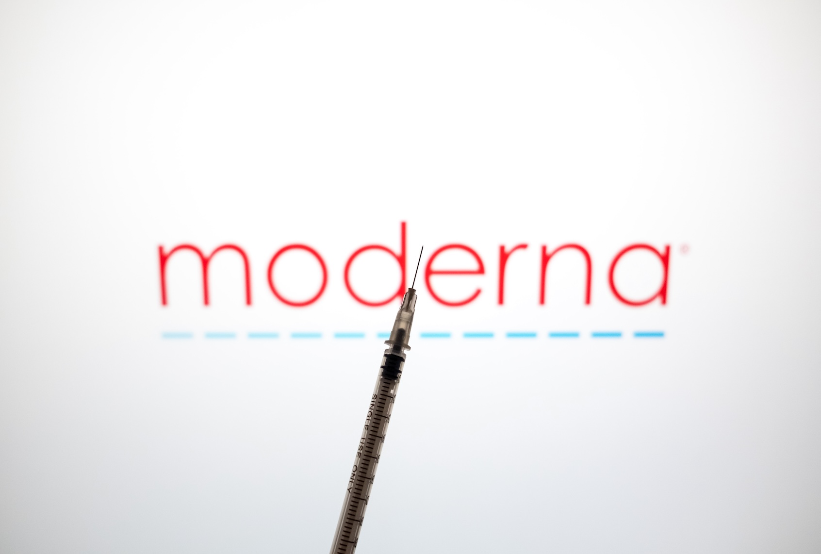 The Moderna logo appears on a laptop computer screen in this photo illustration in Athens, Greece, on February 9, 2026. (Photo Illustration by Nikolas Kokovlis/NurPhoto via Getty Images)