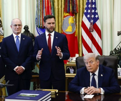 1 of 3 | Vice President JD Vance (2nd-R) speaks as he joins U.S. Ambassador to Israel Mike Huckabee (L) Israeli Ambassador to the U.S. Yechiel Leiter and President Donald Trump (R) in the Oval Office at the White House in Washington, D.C., on Thursday. Photo by Will Oliver/UPI | License Photo