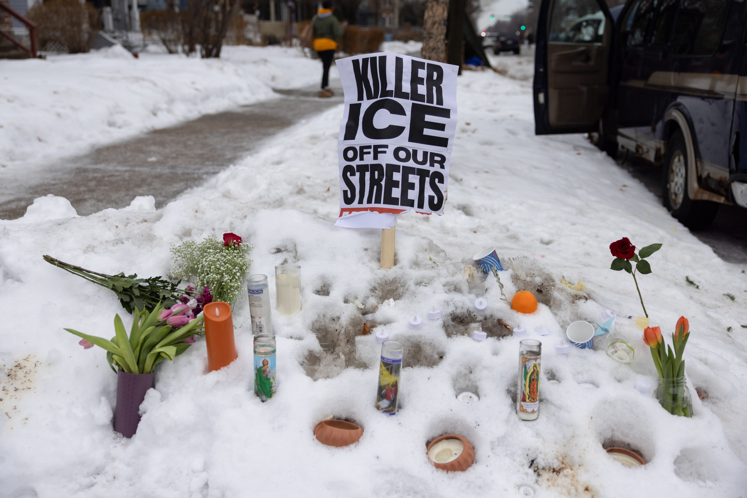 In another video taken in the aftermath of the shots, a woman sits on the snow-covered ground, howling in unimaginable pain, saying, “They killed my wife.” She adds, “They shot her in the head.” She can also be heard saying they have a 6-year-old at school.