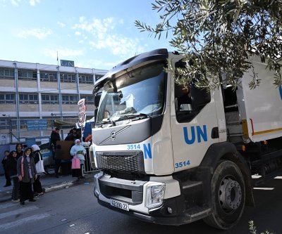 An U.N. truck passes the United Nations Relief and Works Agency girls school in the Deheisheh Refugee Camp near Bethlehem, West Bank, on January 5. A new, targeted model of U.S. humanitarian aid to the United Nations will not provide funding to Gaza projects. File Photo by Debbie Hill/UPI | License Photo