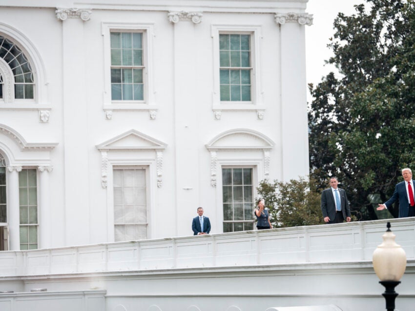 As a confused group of reporters assembled below him on Tuesday morning, Trump strolled around on top of the White House, stopping somewhere above the James S. Brady Press Briefing Room — now only occasionally a venue for taking questions — to tell his audience that he was “taking a little walk” in service of his latest home improvement project: a large ballroom.