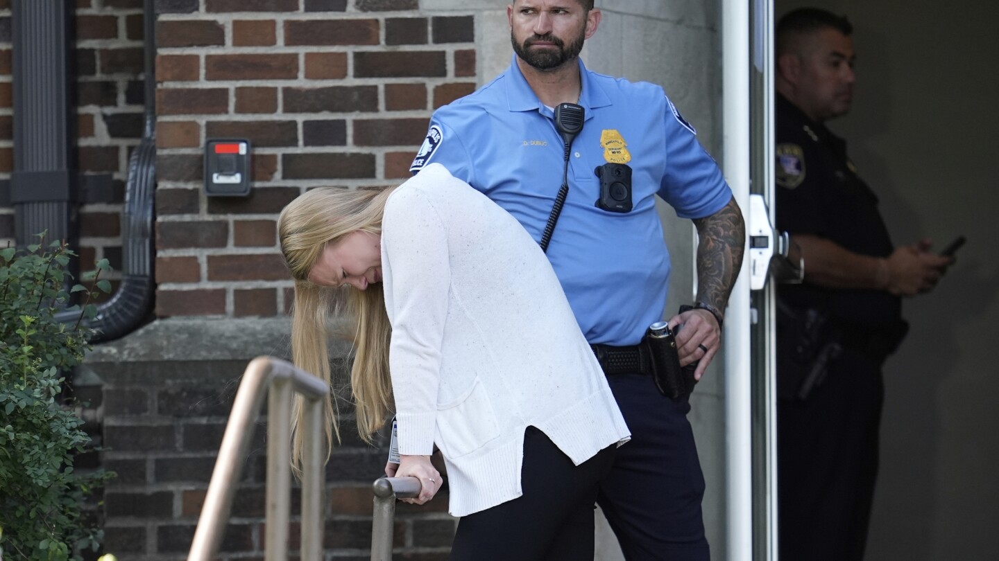 A person walks out of the Annunciation Church’s school as police respond to a reported mass shooting, Wednesday, Aug. 27, 2025, in Minneapolis. (AP Photo/Abbie Parr)